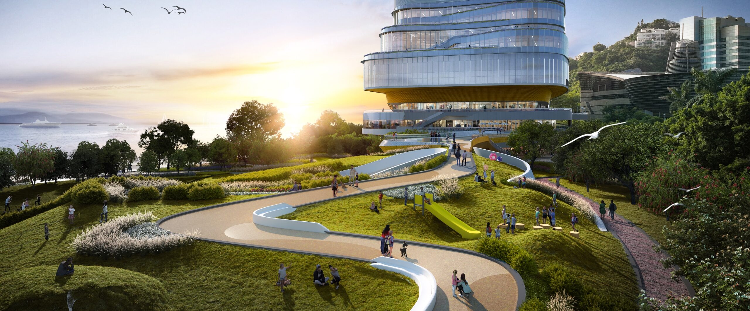 The Cyberport Expansion Project involves the construction of Cyberport 5 building and rejuvenating the community-beloved Waterfront Park. Cyberport 5 is a new ten-storey office building on a 1.6-hectare waterfront site located northwest of the waterfront park and adjoined the existing Cyberport Arcade. The development will provide an additional gross floor area (GFA) of 66,000 square meters, among which 36,000 square meters was office and co-working space representing approximately 30% of the current total floor area. Equipped with advanced smart office facilities, Cyberport 5 will cater to the needs of next generation digital technology enterprises and support the growth of cutting-edge technologies such as artificial intelligence, big data, blockchain, and cybersecurity, while fostering collaboration within the Greater Bay Area.